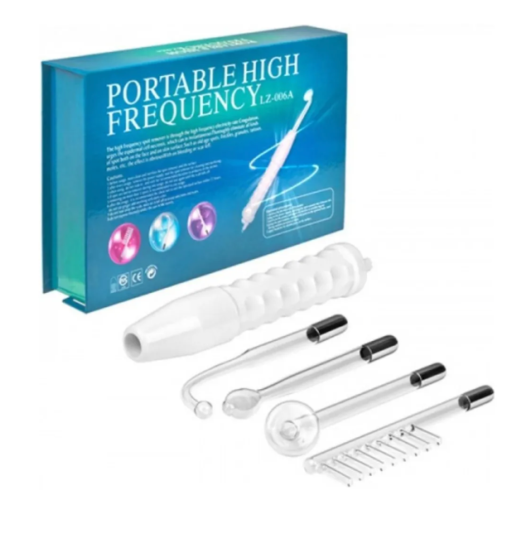 EQUIPO PORTÁTIL DE ALTA FRECUENCIALas acciones de la corriente de alta frecuencia sobre el cuerpo humano, empleando electrodos de cristal llenos de gas, consisten, en primer lugar, en un enrojecimiento más o menos intenso (eritema), señal de aumento de la afluencia de sangre (hiperemia) en la piel y los tejidos, seguido de aumento de calor, ello tiene por consecuencia el enriquecimiento del tejido en oxígeno, a causa de la mayor nutrición, seguida de un aumento de los intercambios intracelulares.Regulador de intensidad en el mango y electrodo único triple.Tratamientos:1) Acné (granillos, pústulas): unos 5 minutos diarios. Intensidad de la corriente débil hasta mediana. Capa de celulosa entre el electrodo y el cuerpo. Granillos tenaces se tratarán por separado.2) Frío: de 1 a 2 minutos, 2 o 3 veces por semana. Corriente fuerte hasta mediana. Una tela de lino entre el electrodo y la piel, se utiliza el electrodo rodillo.3) Insensibilidad de la piel: corriente mediana 2 veces al día, de 5 a 10 minutos.4) Masaje de la cara: el cilindro de masaje (corriente suave). Diariamente unos 5 minutos.5) Caída de pelo, formación de caspa: no se deben usar lociones de cabeza alcohólicas. Corriente suave hasta regular, 1 o 2 veces al día unos 5 minutos, utilizar electrodo cepillo.6) Soriasis: como las citas anteriores.7) Lesiones producidas al afeitarse: electrodo cebolla envuelto en muselina. Corriente media. Frotar la herida hasta terminar la hemorragia.